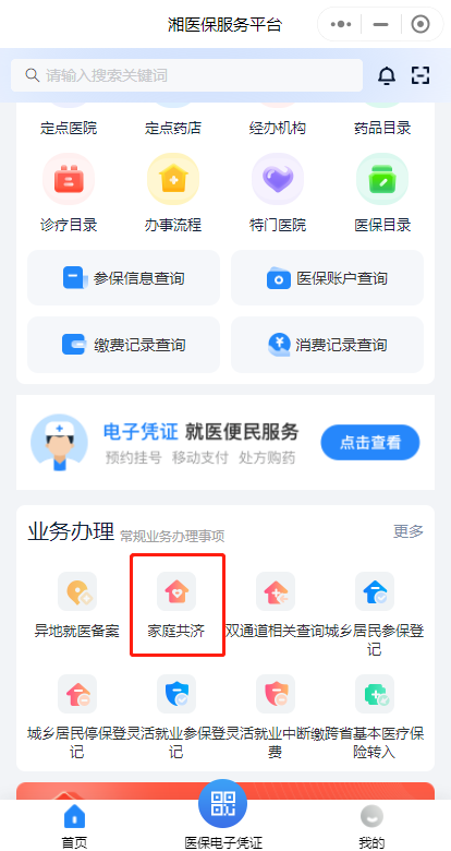 第一步:下載“湘醫(yī)?!盇pp,或進(jìn)入“湘醫(yī)?!盇pp小程序,登錄后在首頁“業(yè)務(wù)辦理”中找到“家庭共濟(jì)”,點擊“共濟(jì)申請”。