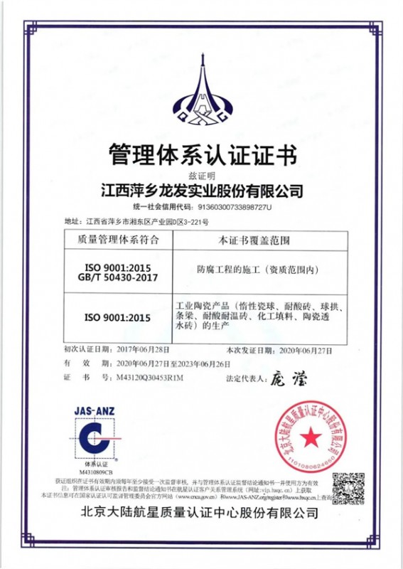 江西萍鄉(xiāng)龍發(fā)實業(yè)股份有限公司創(chuàng)建于2001年,注冊資金1.06億元,占地面積400畝,是“江西省萍鄉(xiāng)市工業(yè)陶瓷行業(yè)商會”會長單位。經過近二十年的持續(xù)健康發(fā)展,公司已成為集工業(yè)陶瓷生產、防腐保溫工程施工、環(huán)保設備制作與安裝于一體的大型股份制企...